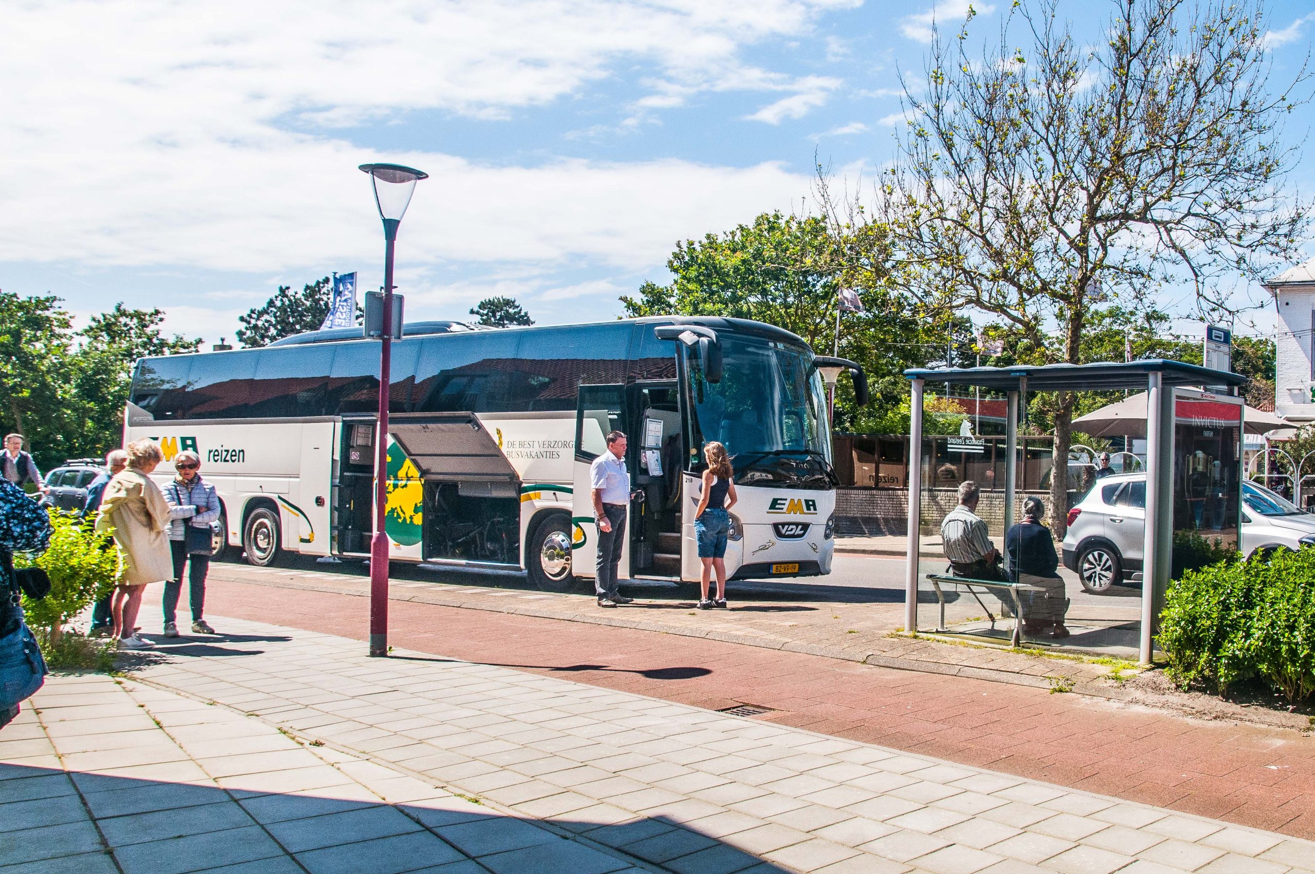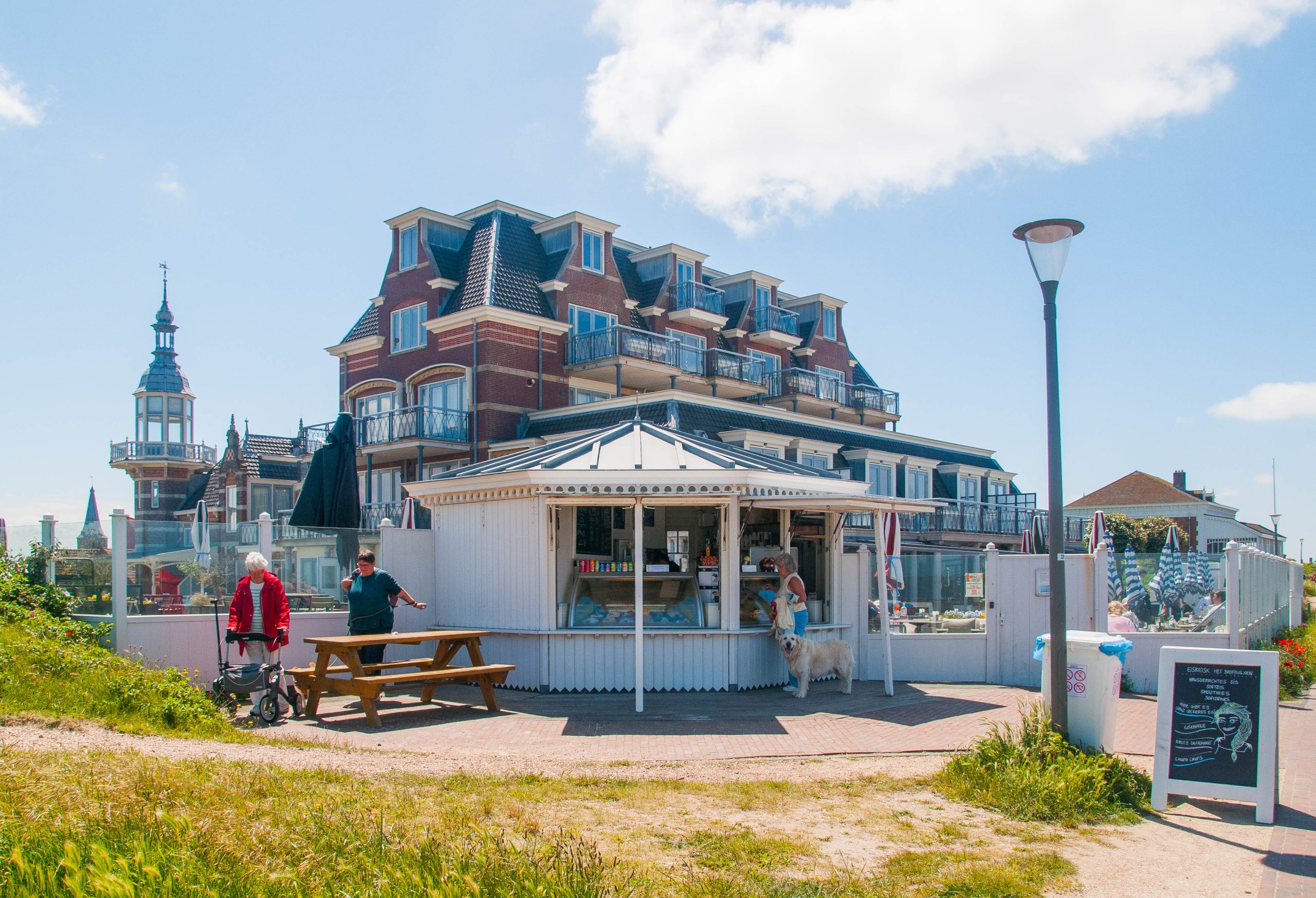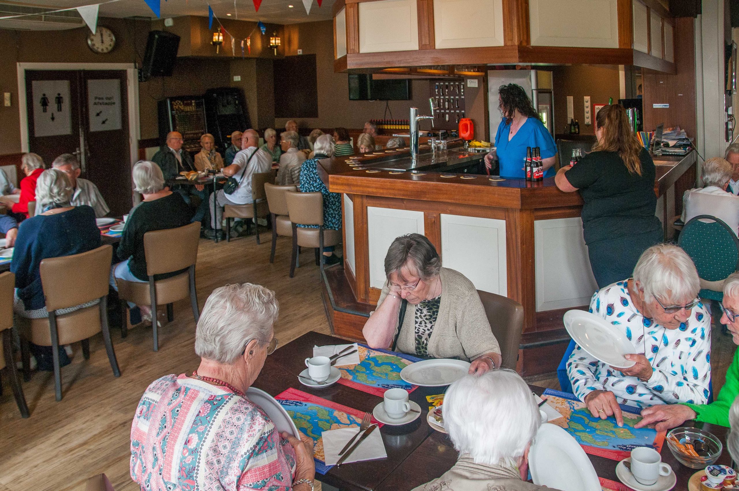 1. de koffietafel, met taartjes staat al klaar 2. daar zitten we dan. 3. naar de lunch. 4. de lunch smaakt goed. 5. we krijgen een kaartje van Domburg. 6. en lopen het stadje in. 7. vanaf een hoge duinrij het stadje. 8. aan de andere kant de zee. 9. veel informatie over het strand. 10. leven op het strand.jpg 11. drukte bij de kleedhokjes. 12. voor iedereen is het strand bereikbaar. 13. weer boven is een monument voor de Belgische commando's die walcheren hebben bevrijd. 14. het Badpaveljoen met groot zonneterras. 15. ook daar is een informatiebord van. 16. de stadskant van het Badpaveljoen. 17. velen op weg narr het strand. 18. het Marie Tak van Poortvliet museum. 19. daarin een tentoonstelling van luminist Edmond Verstraeten. 20. iets fris op het buitenterras van het museum. 21 maar er was een romantischer plekje. 22. ook drukte in het stadje zelf. 23. mooi gekleurde bermen. 24. Cafe Tramzicht (bij de busstop). 25. daar staat de bus weer te wachten op de terugreis. 26. de lucht werd bewolkt. 27. maar het uitzicht mooi. 28. terug bi het koffiehuis, nu voor het diner. 29. het eten werd op tafel gezet. 30. het toetje mocht er wezen.